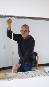 Herr Kraus hat beim Wiederaufbau die Feinarbeiten übernommen und zum Schluss mit seiner Frau provisorisch angewebt.